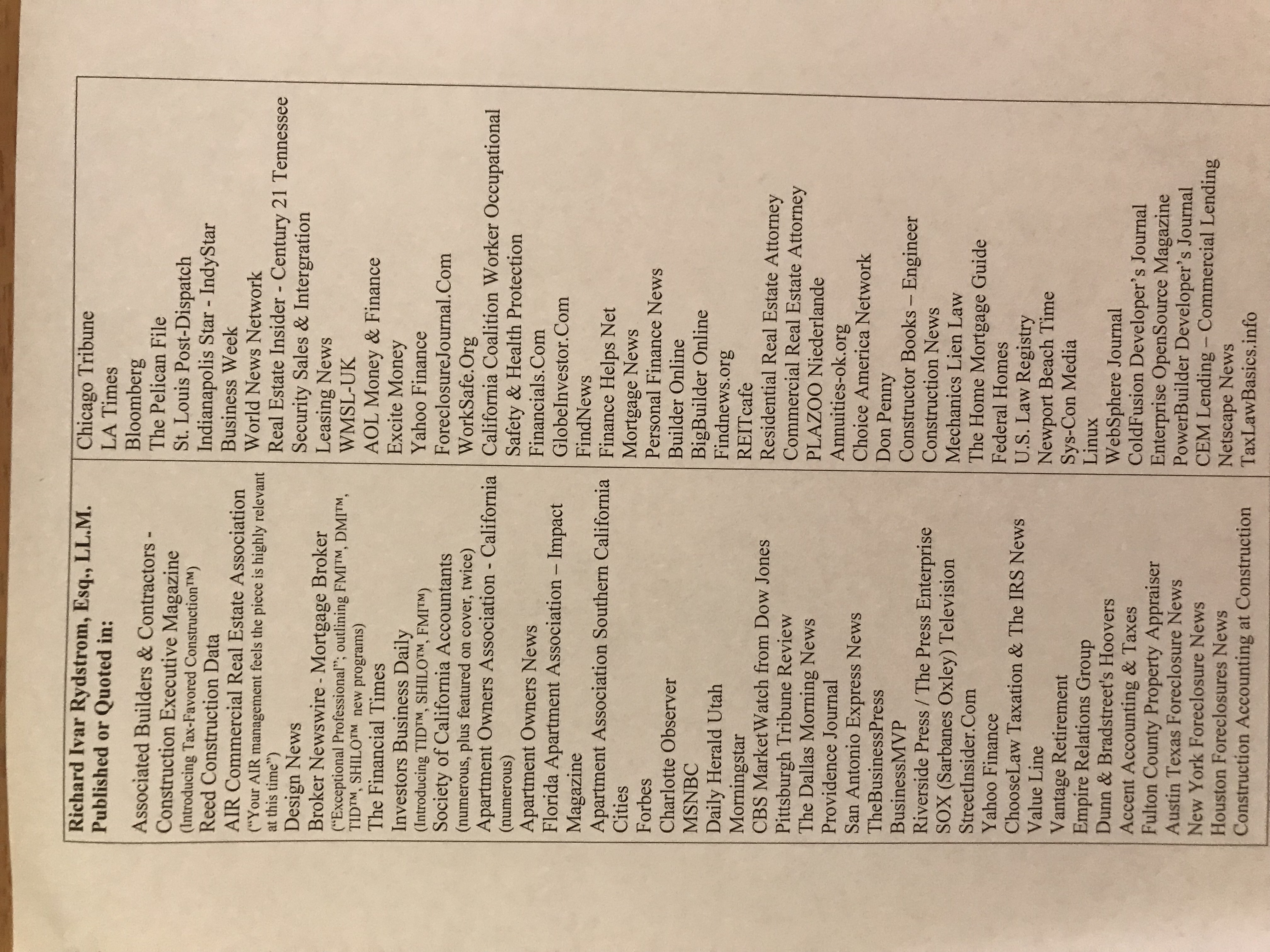 Short Bio Chairman, Rich Rydstrom, Esq.: Mr. Rydstrom has been quoted or published or interviewed by: United States Congress, The Los Angeles Times, iHeart Radio, USA Today Magazine, MortgageOrb, Mortgage Daily News, Orange County Register, Tax.org, National Business Institute, CMISfocus eMagazine, Pepperdine University (Law, Business Journal), AIR Commercial Real Estate Association, Constructor Magazine for the AGC Association, Society of California Accountants, various Landlords and Real Estate Owners associations and others. Richard is a frequent keynote speaker, moderator, panelist, and CLE instructor for National Business Institute for lawyers, judges, banks, and servicers. Richard Rydstrom, Esq. was Chairman of CMIS Mortgage Coalition reconciling diverse and disparate interests of the banks and the consumer borrowers in developing neutral solutions to the Great Recession of 2007, including the HAMP mortgage modification program with the U.S. Treasury and the official foreclosure and consumer groups. When the 110th Congress wanted a neutral analysis and congressional statement regarding the problems and solutions of the pre–Great Recession, they chose Mr. Rydstrom. When the banks and consumer groups wanted a formal explanation and speech regarding the first HAMP Mortgage Modification Program outline for President Obama and the U.S. Treasury, they chose Mr. Rydstrom.